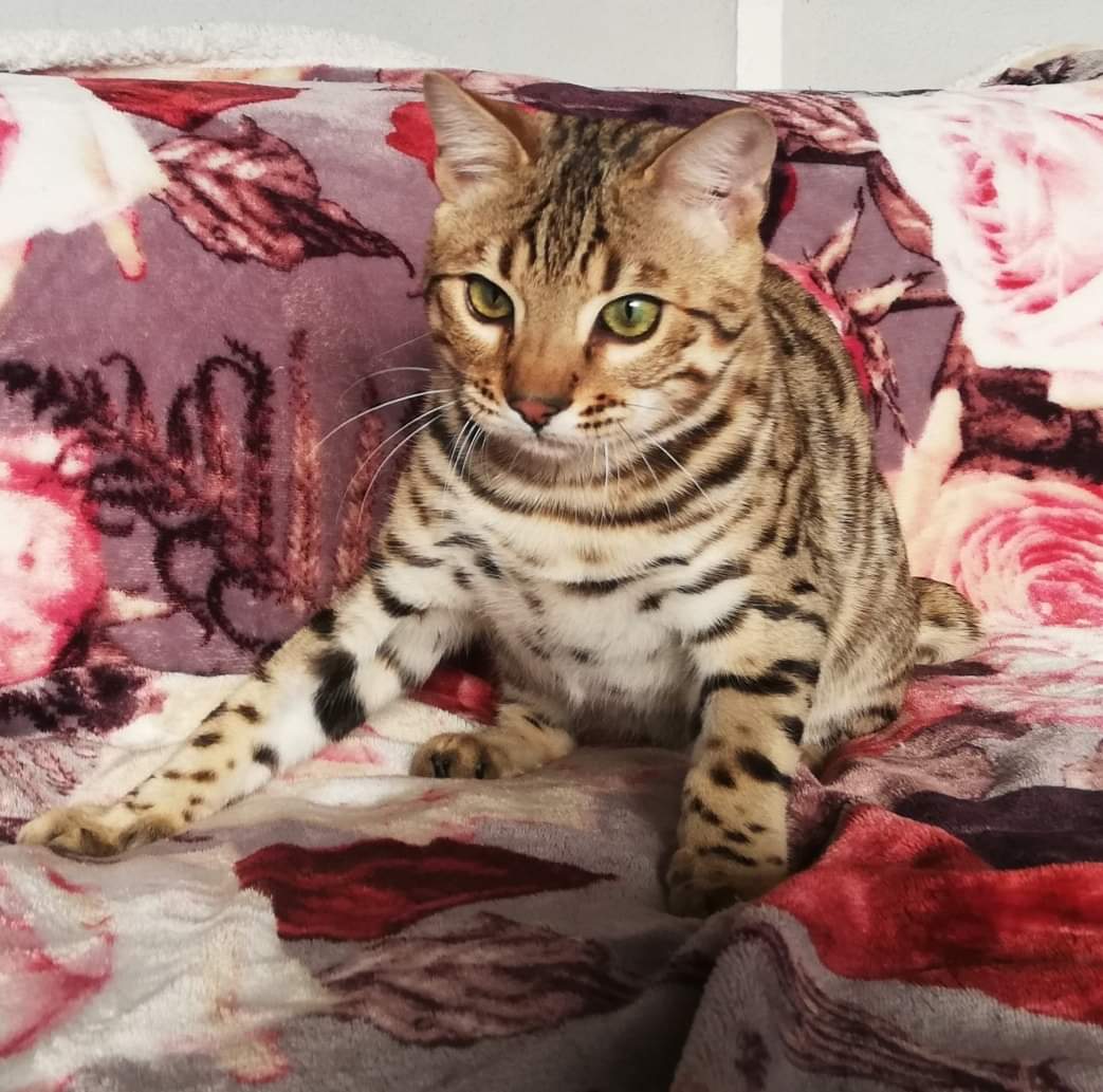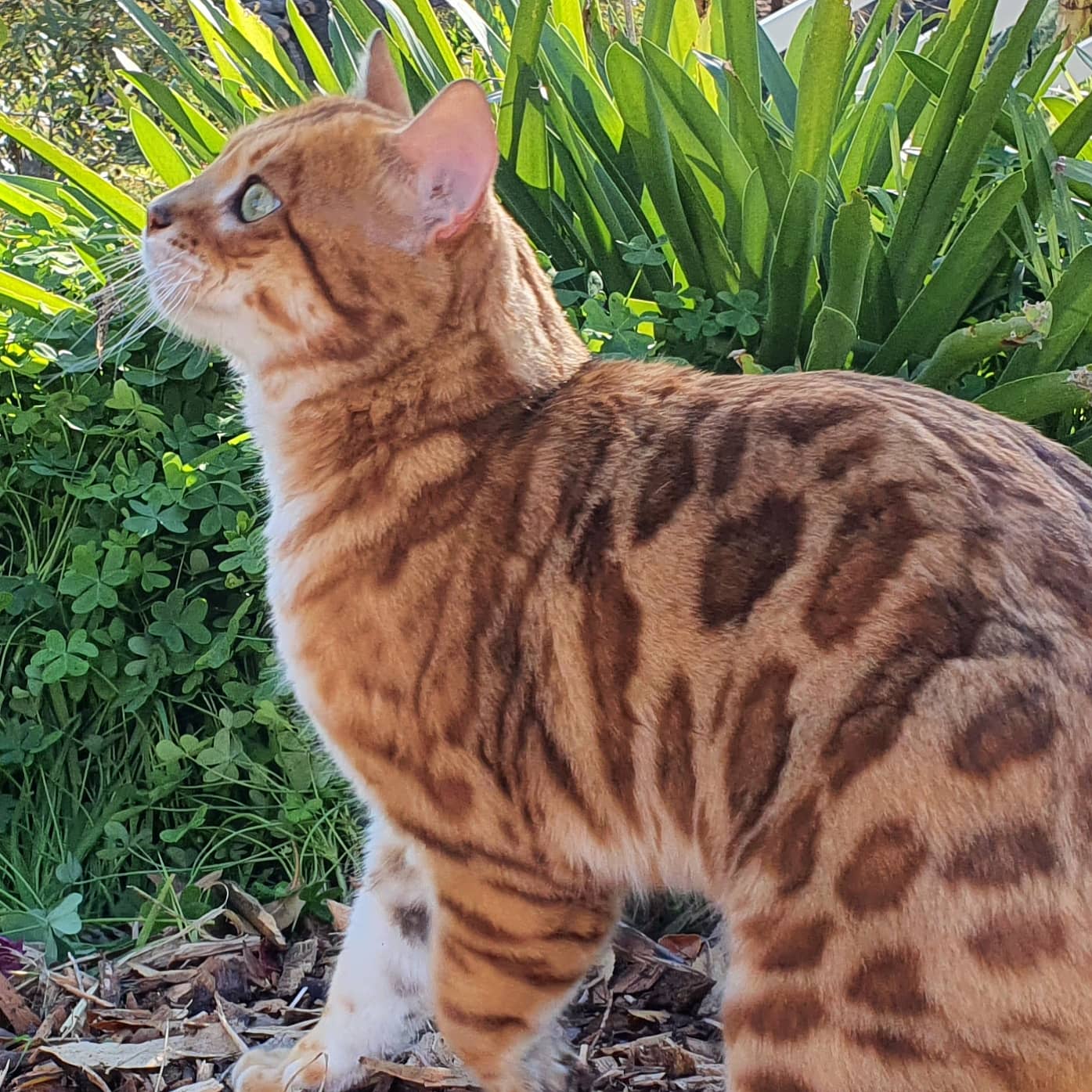 G8 generations from wild cat - Adonis also lovingly called "Baby" is our beautiful rufused brown (green eyes) rosette spotted boy with the very rare and sought after true whited tummy, pictured here at 2.5yrs of age, with big pancake sized rosette spotted pattern. Fully whited (no lockets, was thoroughly examined by Judge Jamie Christian when showing). This boy is so so sweet and has the most wonderful temperament. He has beautiful clarity in his coat that I'm so pleased with especially with this rufus and white colouration it can be hard to achieve. This is a BIG boy and we are expecting him to be one of our largest studs once he finishes growing as he's already over 8k. Adonis is a proven producer of whited kittens and brings type, coat, pattern, whited tummy and fantastic temperament. HCM tested normal 24-FEB-2022 @ 4yr 3m.
