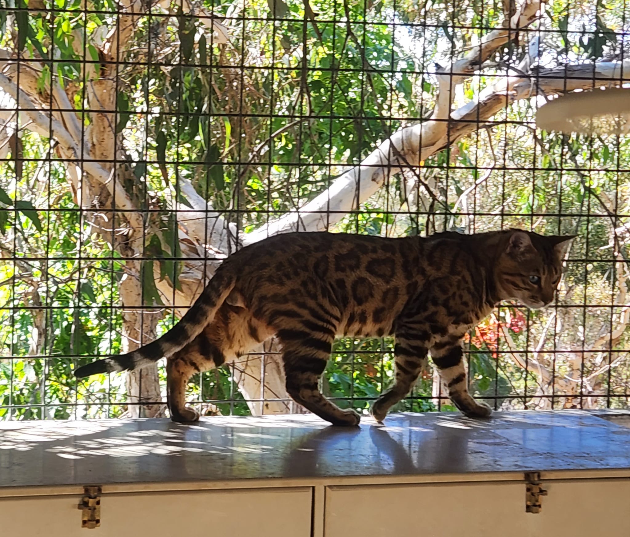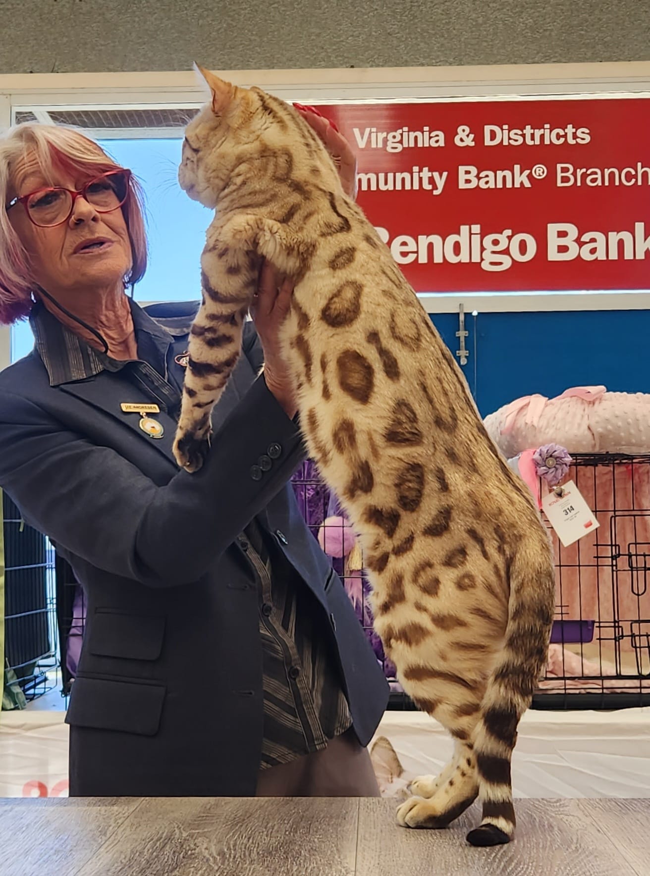 Here's our Seal mink rosetted boy. this boy loves to show and in his first year he went from kitten to adult winning all the prizes and is a multi title winner along with 2023 Best Bengal Kitten, 2023 Debutante of the Year ALL Breeds, 2023 Best Entire (Male) Bengal. I'm very please with his well set nocturnal eyes with a rich aqua colouring starting to really show, puffy whisker pads, good chin, rounded tip ears correctly set, thick tail with a blunt tip, soft coat texture, with correct heavy boned body and knuckly paws with strength and wild cat movement. We are looking forward to him program and giving us some lovely snow, blue and brown kittens. We have been working for a number of years on being able to produce the VERY rare Blue snows (Blue Lynx, Blue Mink, Blue Sepia) and this boy can and will give us these highly rare colours with hopefully excellent bengal type and his sweet temperament like his mum Echo. HCM heart scanned NORMAL 6-MAR-2024 @1yr 4mo of age.